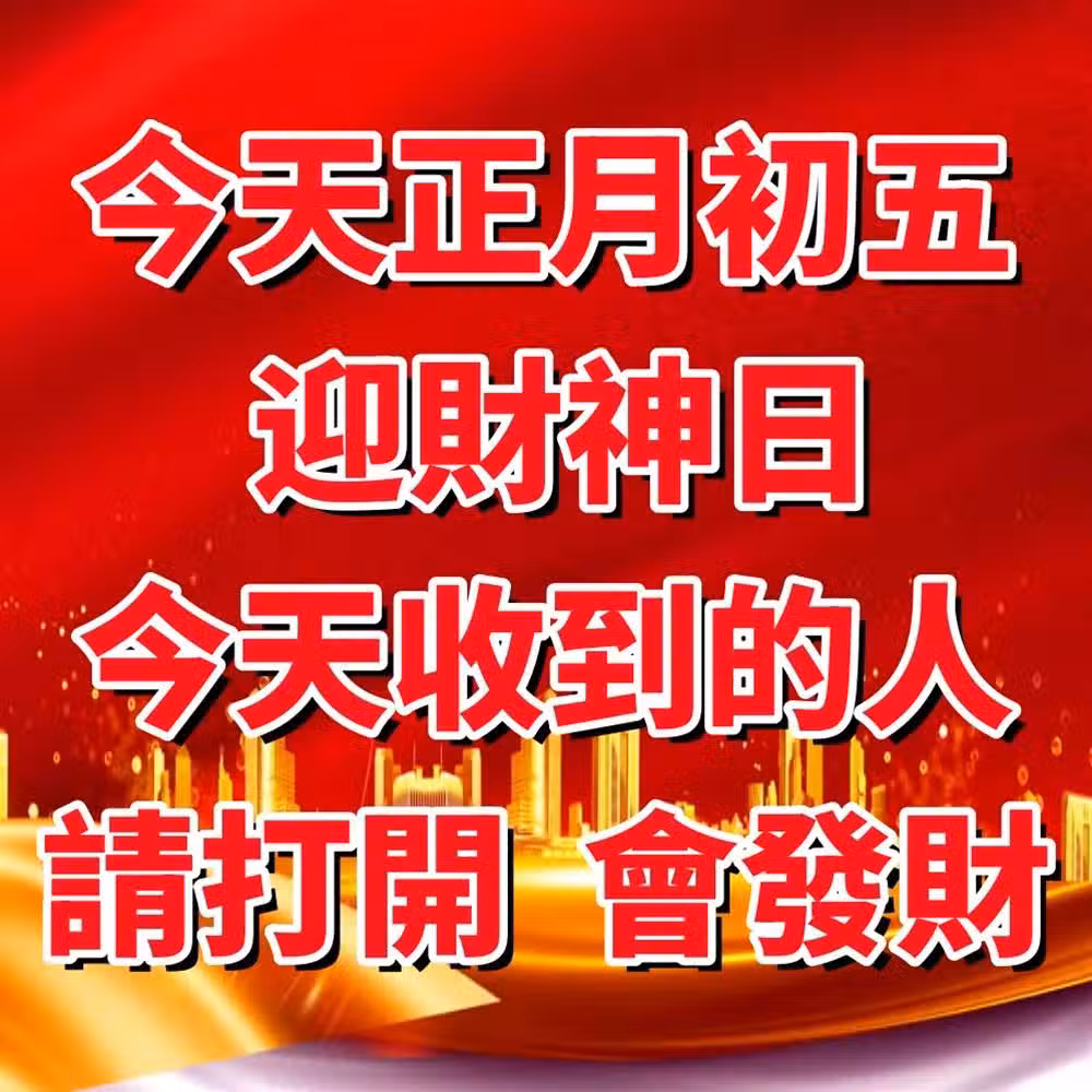今天正月初五! 迎財神日,今天收到的人請打開! 會發財!
