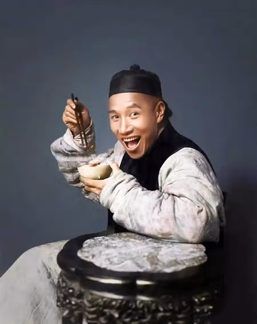 現存於美國國家自然歷史博物館里的一張照片,原照是黑白的,只不過經過上色更是讓人感喟良久。吃飯吃得如此開心,真是應了一句話:亂世之中,一要吃飽,二才是生活。