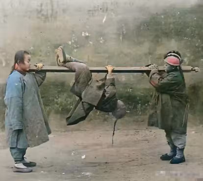 玩耍的孩童,一根木頭就是當時的玩具,而且三個人玩的不亦樂乎。
