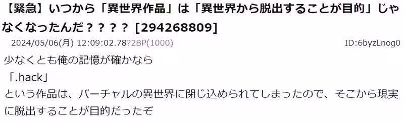 日本討論區「5ch」最近出現了這篇討論串。發文網友質疑「異世界作品」以前還是以「逃離異世界」作為劇情主軸,曾幾何時卻再也不是這麼回事了。如今的異世界作品,劇中人物常常都果斷決定要待在異世界生活了啊!