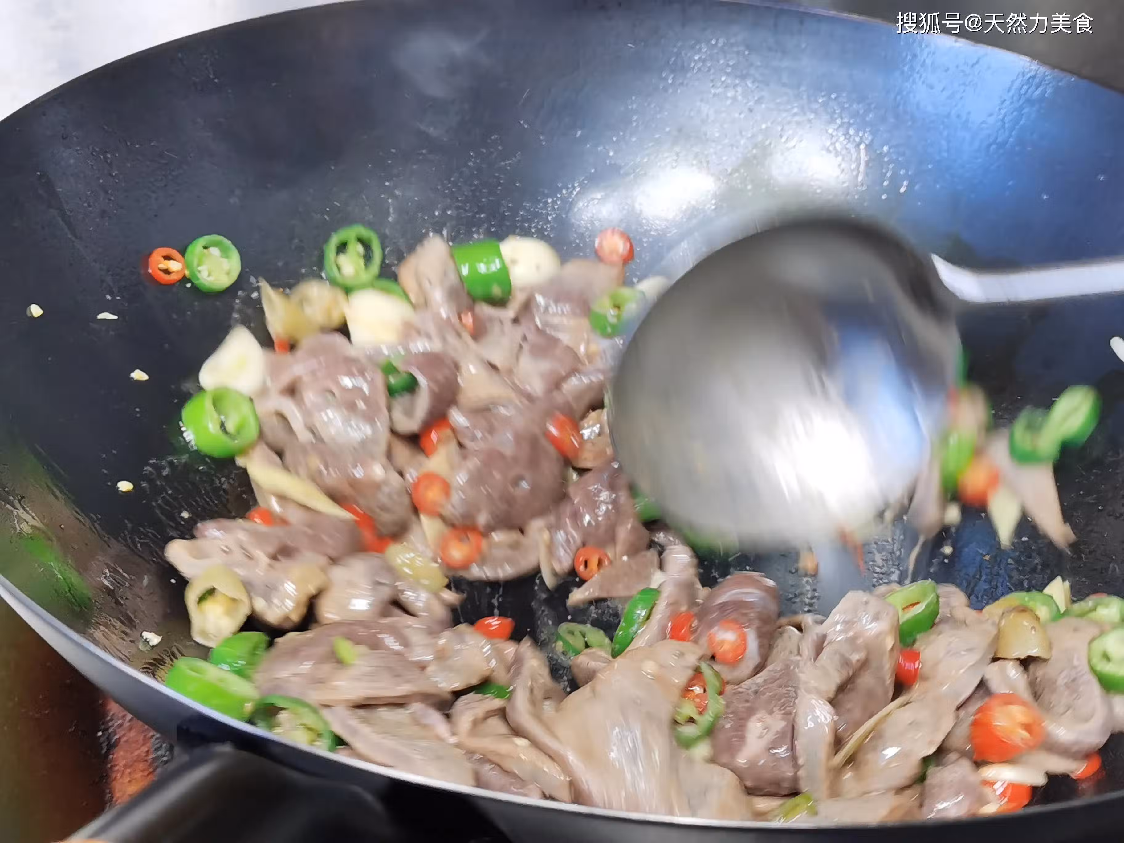 4、快速翻炒均勻,這個過程最多控制在30秒之內就要出鍋。這樣從豬肝下鍋到出鍋大概也就在1分鐘左右。這樣炒出來的豬肝才鮮嫩。但是有一點我要強調一下,那就是我們在炒豬肝的時候不能一味求嫩,一定要把豬肝炒至斷生,如果家裡的小灶火力太小,那就稍微炒久一些。