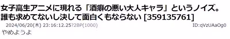 日本5ch討論區最近出現了這篇話題文章。發文網友批評所謂許多以女高中生為主角群的漫畫、動畫當中,經常會出現的一種「酒品糟糕的大人角色」。他認為這種角色對作品毫無加分,甚至只會為作品扣分,根本不應該存在作品裡!