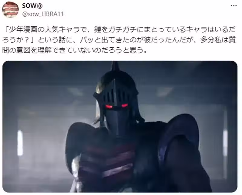 日本輕小說作家SOW,最近在X聊起了「穿著厚重鎧甲的少年漫畫人氣角色」這個話題,還舉出了《金肉人》的羅賓假面作為例子,引髮網友們的熱烈反響!