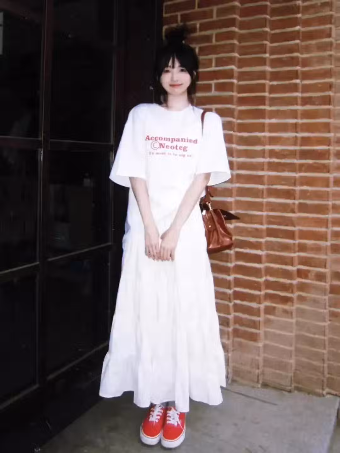 而且,白色的短袖T恤和半身裙也比較百搭,也不挑人,更加不挑年齡,如果你想要休閒的穿搭風格,可以選擇休閒一些的「鞋子」來搭配,比如像博主穿搭的紅色帆布鞋,或者是下面這位素人穿搭的藍色運動休閒鞋,都能增加休閒感和時尚感。