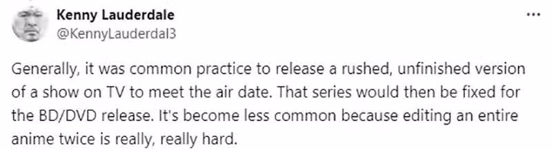 頻道擁有30萬訂閱者的美國動漫YouTuber「Kenny Lauderdale」,最近在X發文聊起了他看日本動畫的時候,總喜歡看電視播映版,而不是BD或DVD版。
