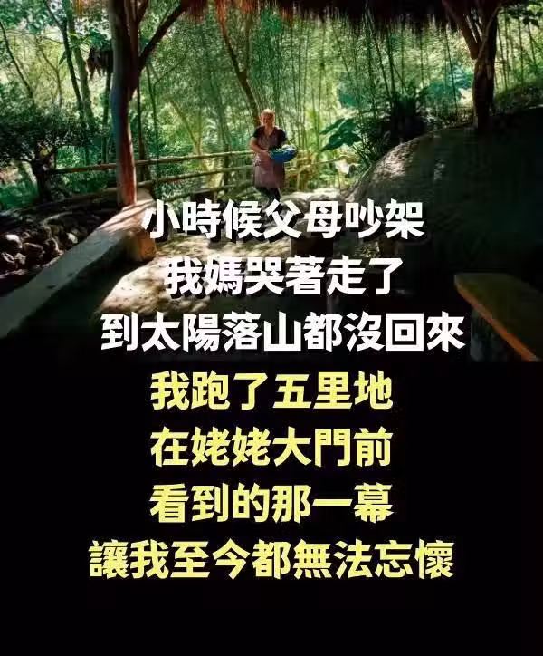 小時候父母吵架,我媽哭著走了,到太陽落山都沒回來,我跑了五里地,在姥姥大門前看到的那一幕,讓我至今都無法忘懷。