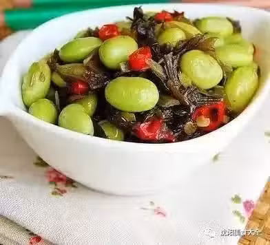 原料:毛豆200克、雪菜1袋(80克)、新鮮紅辣椒2根、薑末、糖、鹽少許、油適量