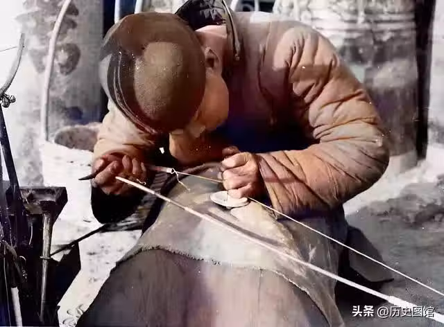 一名鋦瓷匠人,正在修復瓷器。鋦瓷,就是把破裂的瓷器拼好,用金剛鑽鑽孔再用像訂書釘一樣的金屬「鋦子」嵌住抓牢,使其恢復原樣,能再使用。鋦瓷在中國瓷文化中,占有了一席之地,屬於非物質文化遺產。