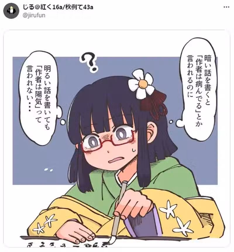 日本一位暱稱「じる」的同人創作者,最近在X聊起了每當創作者寫出充滿陰鬱氣氛,帶有負面情感的作品時,總會被讀者或觀眾懷疑精神健康出狀況的問題。