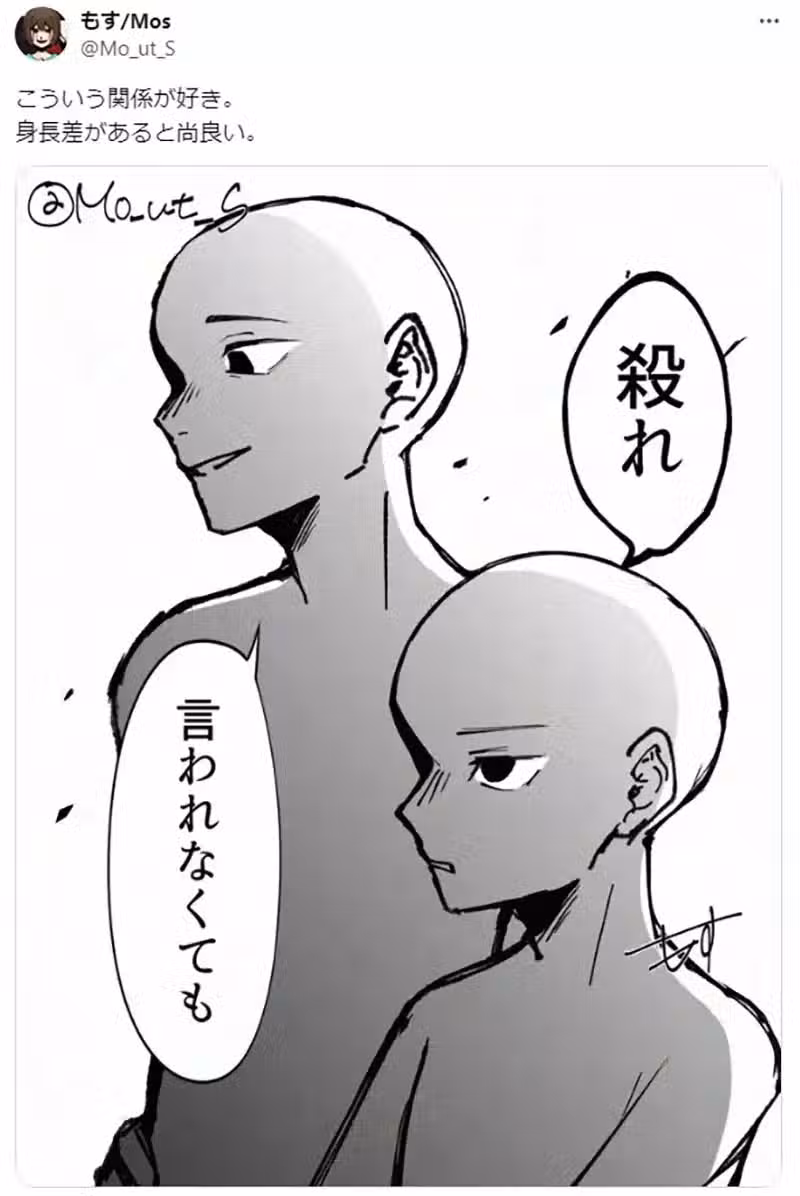 這位暱稱もす(Mos)的日本網友,最近藉由上面這張插畫,表示自己非常喜歡動漫作品當中,身高落差很大的高矮配搭檔。這種高矮配搭檔常常是身高較矮的一方,握有較強的命令權或是主動權。但是身高較高的一方也不會只是唯唯諾諾,反而偶爾還會故意調侃對方,形成一種絕妙的搭檔關係!
