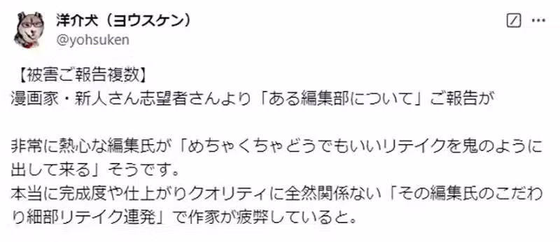日本漫畫家洋介犬,最近在X發了一系列文章,爆料漫畫業界有著毒瘤編輯,隨即引髮網友議論!