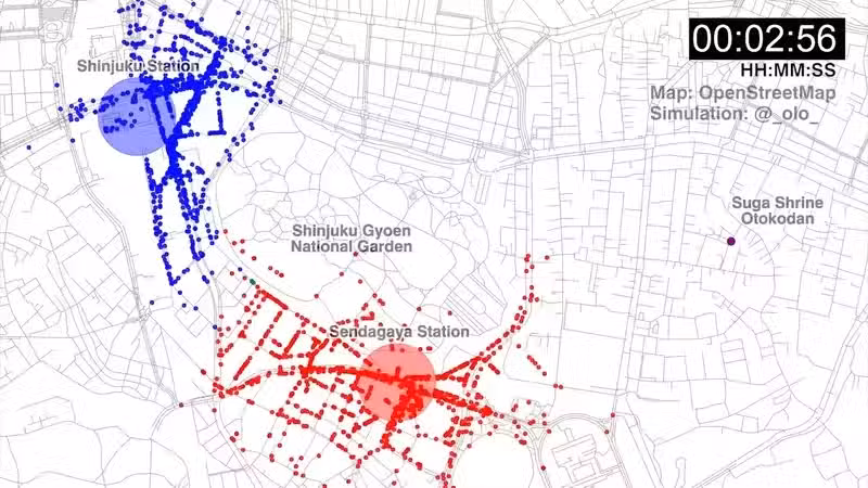 模擬1小時之後有好幾對相遇,然而在那間神社(紫點)附近相遇的一對都沒有