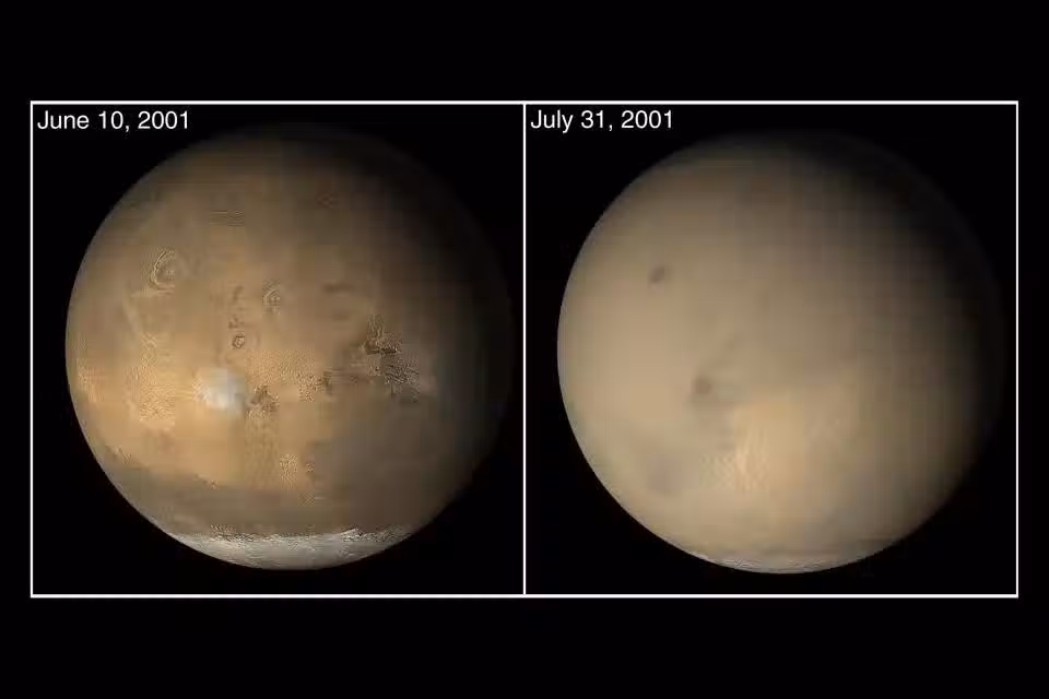上圖可以看到火星沙塵暴可以覆蓋全球,遮天蔽日,從太空看整個火星灰濛濛的,完全看不到表面特徵。