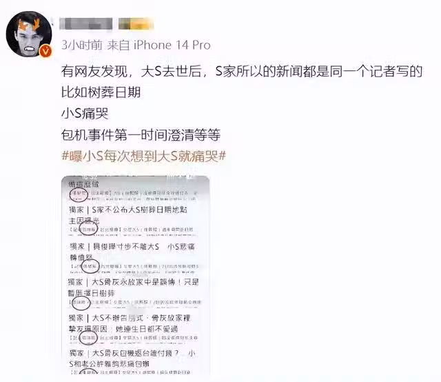 這名記者是台北的,19天都在報道大S骨灰安置問題、孩子歸屬問題、遺產爭奪問題,這些全都是為S家洗白的報道。