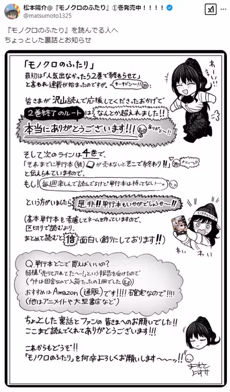 日本漫畫家松本陽介最近在X發了一篇文章,講述自己正在連載中的作品《モノクロのふたり》在過去所面臨的危機,以及未來可能面臨的危機,引髮網友議論!