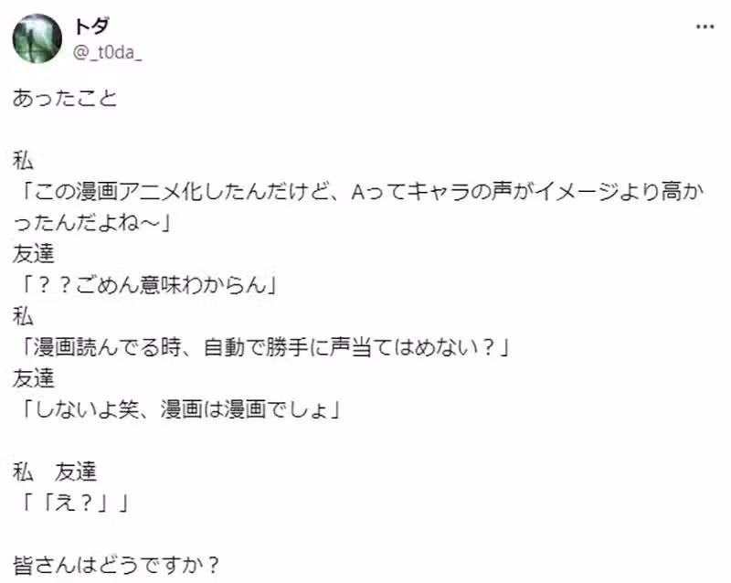這位暱稱「トダ」的日本X網友,最近發文聊起了自己看漫畫的時候,總是會自行在腦中替漫畫角色配音。然而他的朋友卻完全沒有這種習慣,甚至覺得漫畫無聲是理所當然,讓他大感震驚!