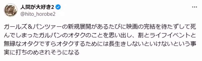 最近一位暱稱「人間が大好き2」的日本X網友,發文聊起了《少女與戰車》這部動漫作品的本篇遲遲不完結,卻又不斷推出各種新企劃,導致陸續有粉絲等到去世的問題,引髮網友們的熱烈反響!