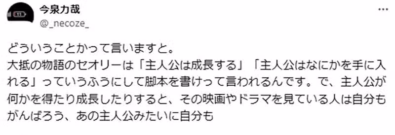 「但是現實生活可沒那麼簡單。回歸日常生活之後,無論是工作還是戀愛,很多時候都不會順利。這個時候人們就會開始覺得:『果然電影里的那個主角是特別的,所以他才有資格成為電影的主角。』」