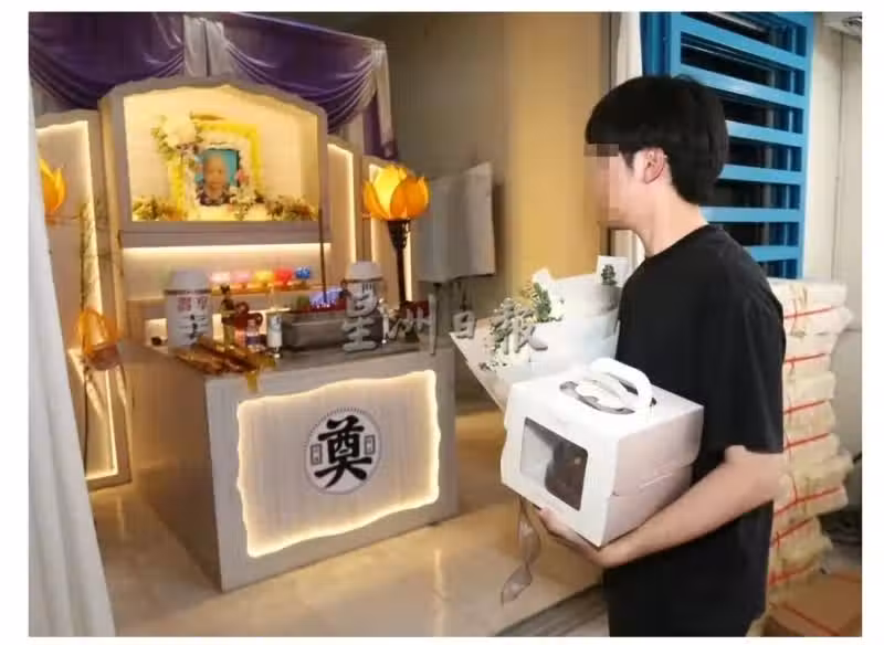 蘇先生今天下午約3時,手捧一束康乃馨與一小盒母親節蛋糕,與父親等人抵達喪府,先向李公洋致意,對方隨即點頭,然後指引他到母親的靈堂前上香拜祭。