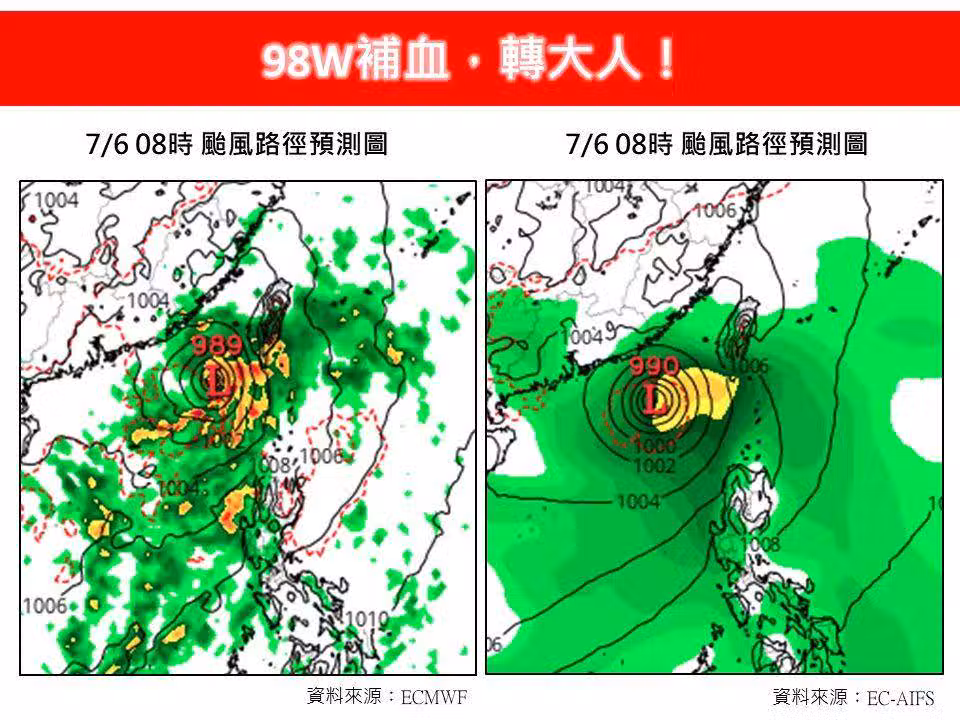 氣象專家林得恩在「林老師氣象站」臉書專頁表示,目前位於巴士海峽的熱帶擾動98W,在進入南海海域後,環境提供有利再發展的條件,強度也有逐漸增強的趨勢,甚至進一步發展為輕台機率也在增高。由於距離台灣實在太近,一旦系統整合後,將會沿著台灣海峽一路北上,對我影響明顯增加,最大風雨則會落在周六及周日(7/5、7/6)。