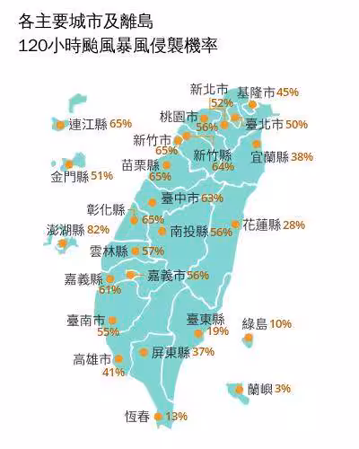 桃園市:56%宜蘭縣:38%基隆市:45%新竹縣:64%新竹市:65%中部苗栗縣:65%台中市:63%南投縣:56%彰化縣:65%雲林縣:57%