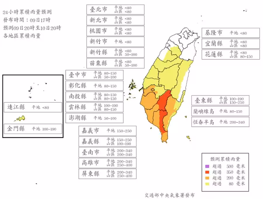 根據最新24小時雨量預報,高雄市山區和屏東縣山區預估雨量達250到400毫米,台東縣山區雨量則估有150到250毫米,達到停班課標準。