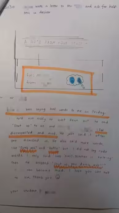 受害者曾把被辱罵的過程寫下,交給老師。(取自8視界新聞網)
