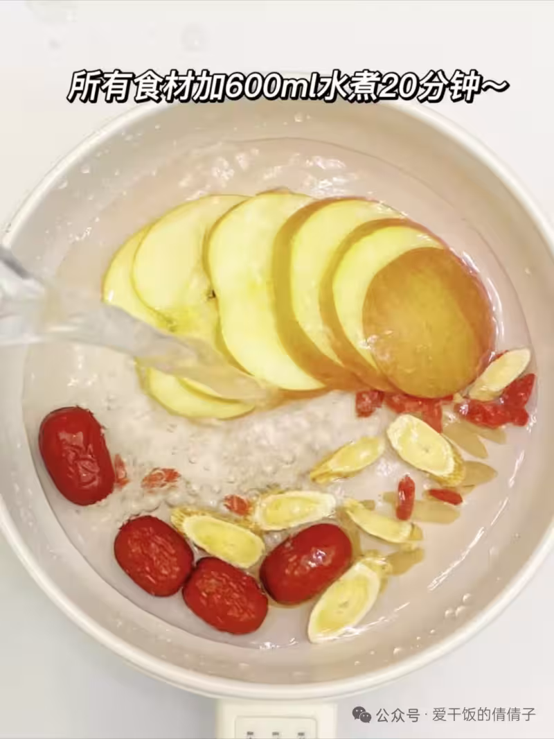 1️⃣ 黃芪、麥冬快速沖洗; 2️⃣ 蘋果、紅棗、枸杞一同入鍋; 3️⃣ 加600ml清水; 4️⃣ 煮沸後小火再煮20分鐘。 💡倩倩提醒:紅棗去核更舒適,煮好撈出黃芪麥冬渣。