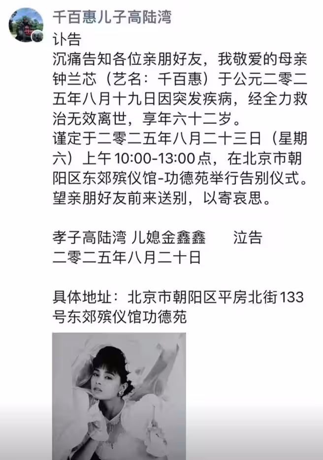 黃安今(20日)晚間在微博發布訃告,台灣著名歌手千百惠於8月19日凌晨因病去世。(圖/翻攝自千百惠抖音)