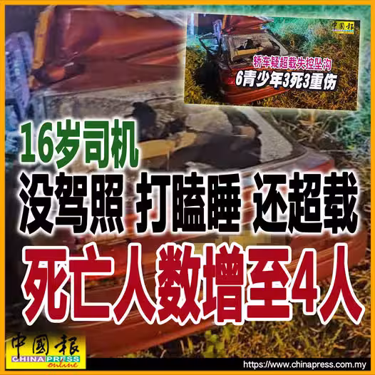 (瓜拉冷岳23日訊/2PM更新)警方證實,6名青少年共乘轎車沖入水溝意外,該輛轎車不僅超載,16歲司機沒駕駛執照,他在開車時因打瞌睡,最終釀禍!