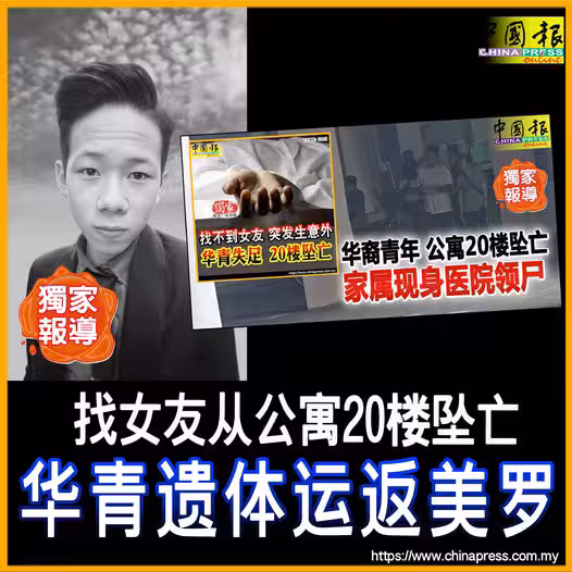 (吉隆坡23日訊/獨家報導)昨日去找女友時不慎從公寓20樓墜亡的華裔青年,其遺體將被運返霹靂家鄉辦理身後事,並在美羅新村設靈1天,以讓親屬前來瞻仰死者遺容。