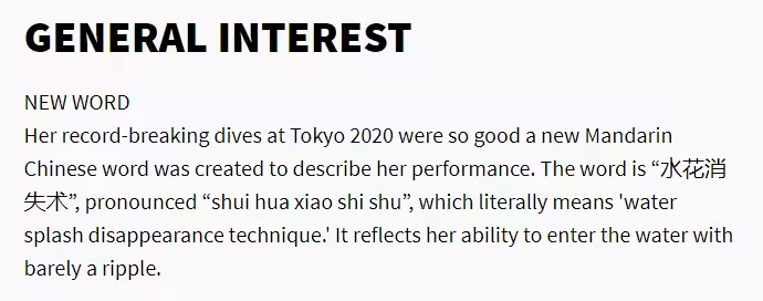 她在2020年東京奧運會上的跳水成績打破紀錄,非常出色,人們甚至創造了一個新的中文詞彙來形容她的表現。這個詞是「水花消失術」,發音為「shui hua xiao shi shu」,字面意思是「水花消失的技術」,表示她在入水時幾乎不會激起漣漪和水花。