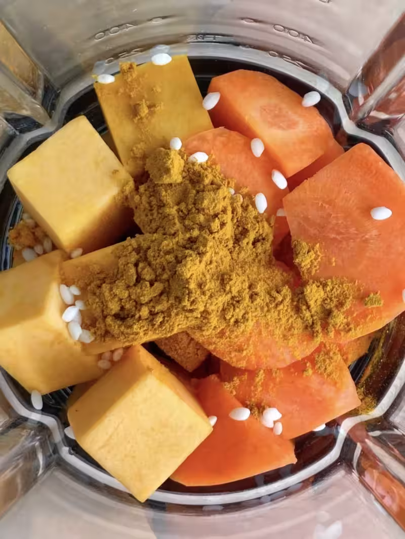 需要的材料有南瓜80克、胡蘿蔔半個、糯米10克、薑黃粉3克。