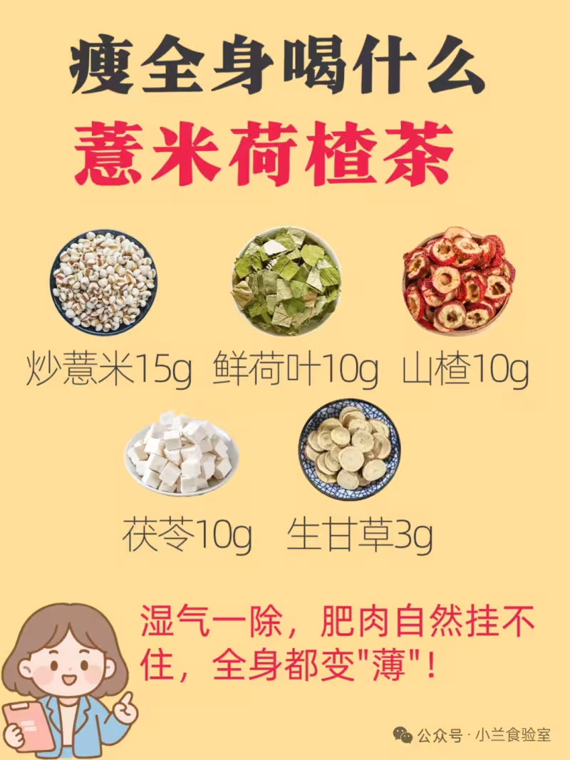 功效:炒薏米+茯苓雙倍祛濕,山楂消積滯。濕氣一除,肥肉自然掛不住,全身都變"薄"!