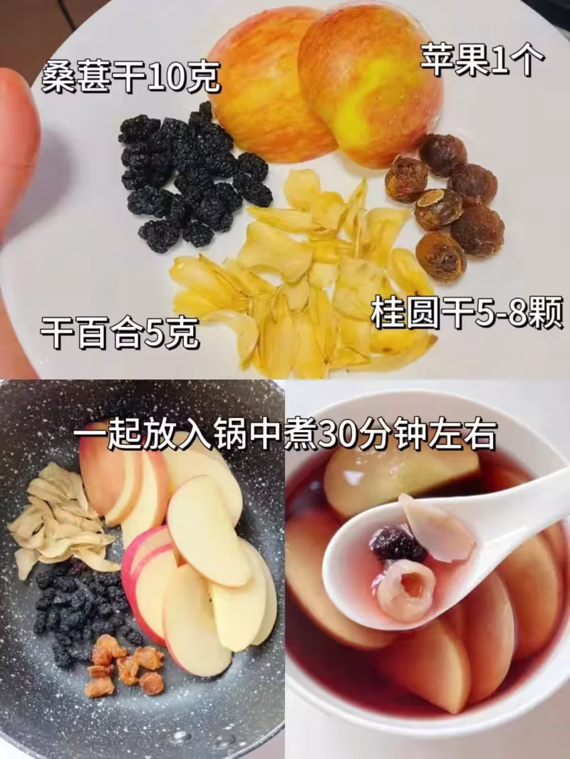 蘋果用清水沖洗乾淨,不用削皮,對半切開後去掉果核,切成小塊。干百合和桑葚干簡單沖洗一下,和桂圓乾、蘋果塊一起放進湯鍋。加入適量清水,大火燒開後調成小火,慢慢煮30分鐘左右,看到湯色變深、食材軟糯即可關火。