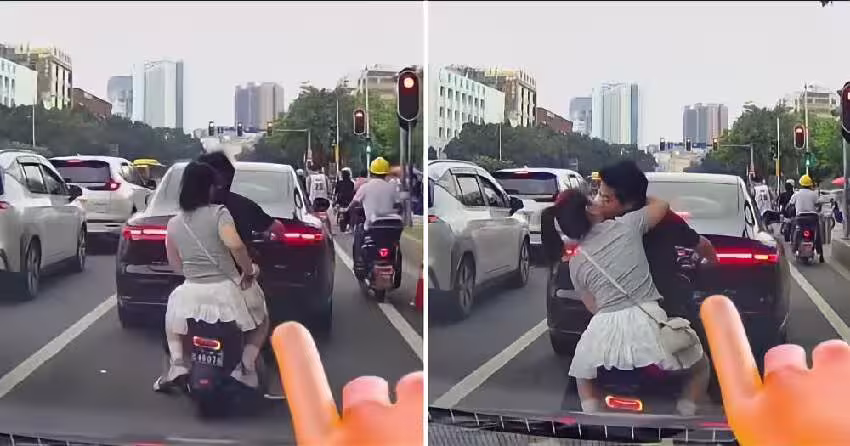 視訊中,一對情侶騎著摩托車停在路上肆無忌憚地秀恩愛,把周圍的司機尷尬得不行。