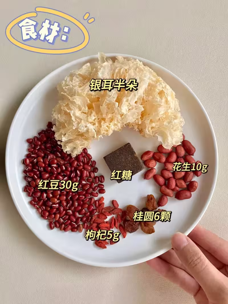 首先把半朵干銀耳用清水泡發開,然後去掉底部黃色的硬蒂,撕成小朵備用。花生和紅豆提前用清水浸泡2小時以上,這樣打出來會更細膩。桂圓去殼,枸杞簡單沖洗一下即可。