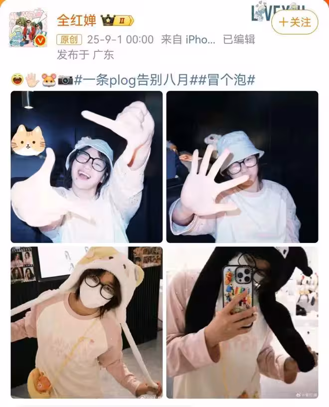 9月1日凌晨,全紅嬋在個人社交平台曬出戴黑框眼鏡的四連拍照,並配文:一條plog告別八月。