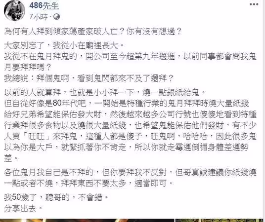 圖片:網絡、三立新聞很多好兄弟會以為你是大戶,就緊抓著你不肯走,所以你就走霉運倒楣身體差運勢差,農曆七月要拜可以,但紙錢只要燒一點,或是一點都不燒,拜拜供品不用太多,聽哥的,不會錯。」。