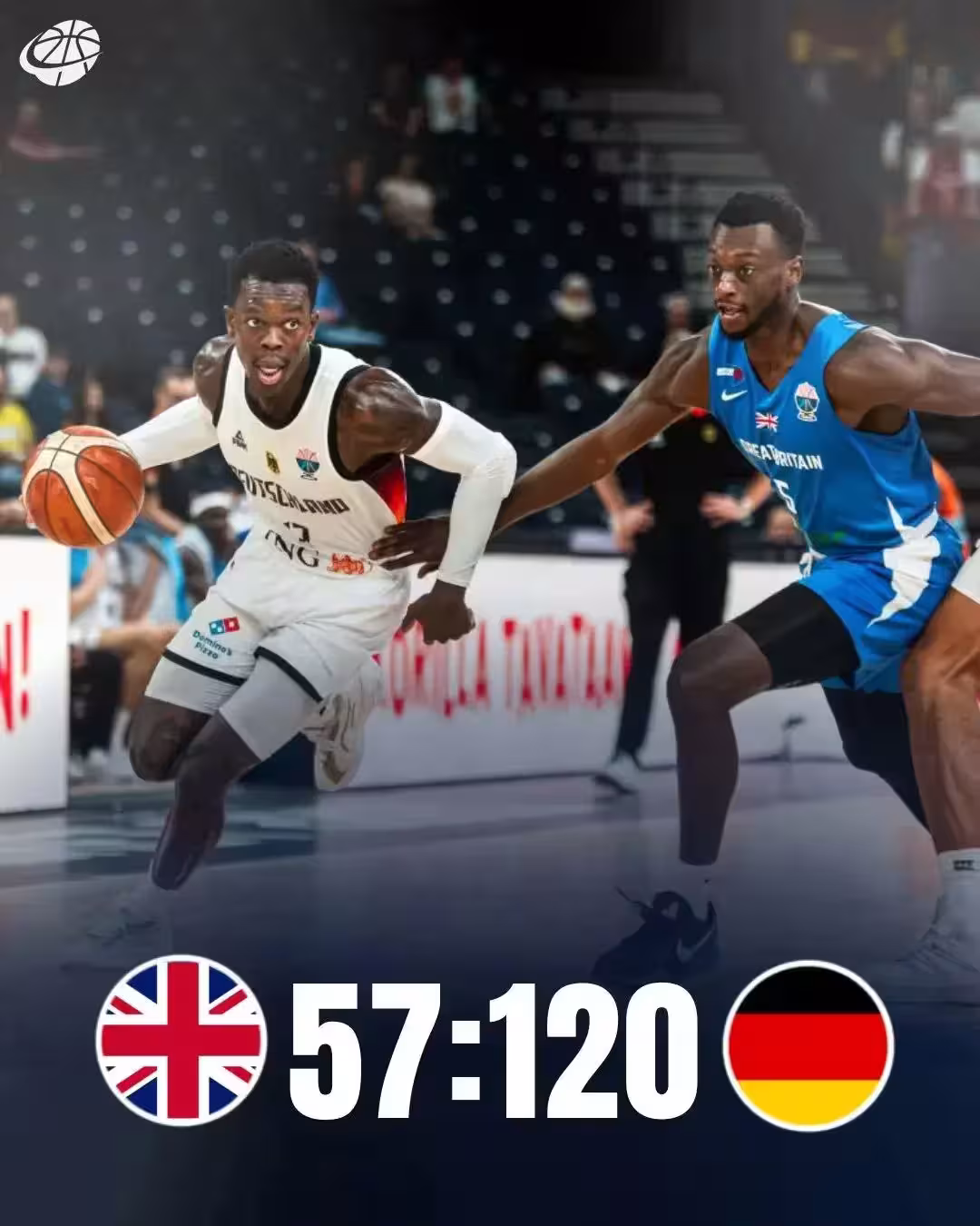 德國隊4勝0負,高居B組第一。四場一共凈勝對手134分,本屆歐洲杯排第一。此役施洛德15投8中,拿到19分2籃板5助攻。小華格納9投6中拿到18分1籃板10助攻。替補球員達-席爾瓦12中10,轟下25分5籃板2助攻,正負值+56!