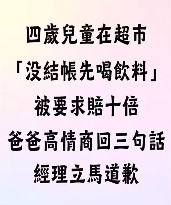 4歲孩童在超市「沒結帳先喝飲料」被要求賠10倍 爸爸「高情商回三句話」經理立馬道歉