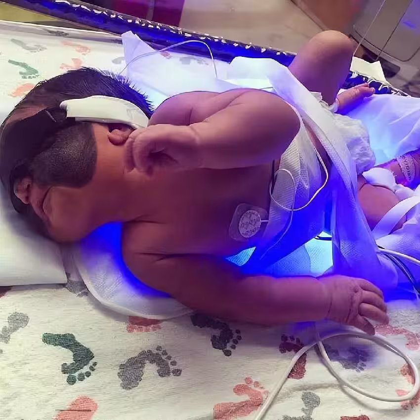 原來這名剛出生的嬰兒臉上出現了大面積的黑色皮膚,看上去就像個「怪物」一樣。