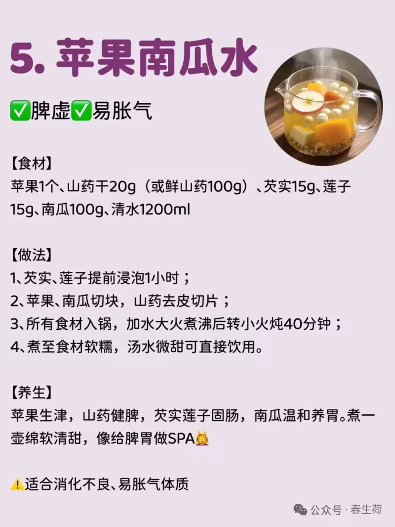 芡實、蓮子提前浸泡 1 小時,蘋果、南瓜切塊,山藥去皮切片,所有食材入鍋,加 1200ml 清水大火煮沸後轉小火燉 40 分鐘,煮至食材軟糯,湯水微甜可直接飲用。