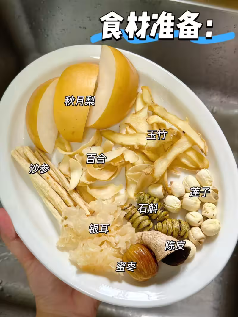 排骨適量、秋月梨🍐1個、石斛10g、沙參15g、玉竹15g、百合10g、蓮子15g、銀耳適量、陳皮、蜜棗