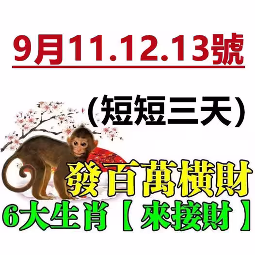 而 在9月11、12 、 13號這短短三天的時間裡就會有大運勢,到時候短短三天便有百萬橫財可發,生肖猴卻迎來了一場大運,而且還是橫財大運,讓屬猴的人在這兩天的時間裡會有百萬橫財進帳,所以生肖屬猴的各位快快來接財,錯過就沒了。