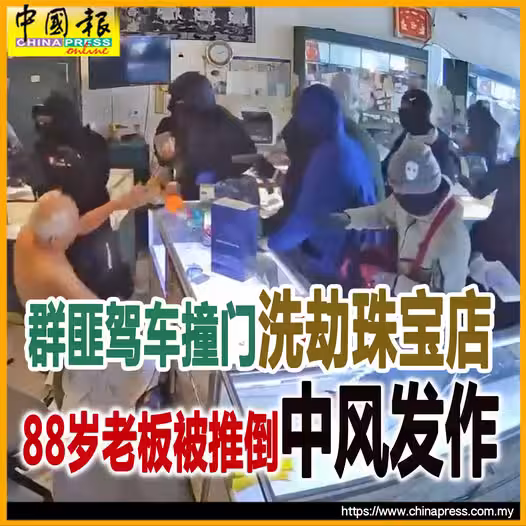 (華盛頓12日綜合電)美國加州聖何塞一家珠寶店9月5日下午2時遭到洗劫,10幾個蒙面匪徒駕車撞爛店鋪大門,還把88歲老闆推倒在地,導致他受傷並中風發作。