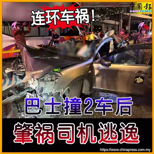 (吉隆坡14日訊)吉隆坡市中心深夜發生3車連環撞車禍,巴士司機被指連撞2輛轎車後逃逸,導致其中一輛轎車被撞成「廢鐵」,造成至少2人受傷,被緊急送往醫院救治!