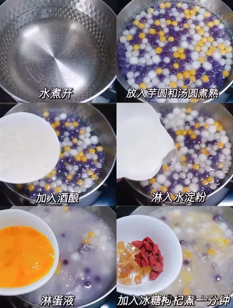 1. 水開放糯米圓子煮至浮起,加酒釀煮沸。