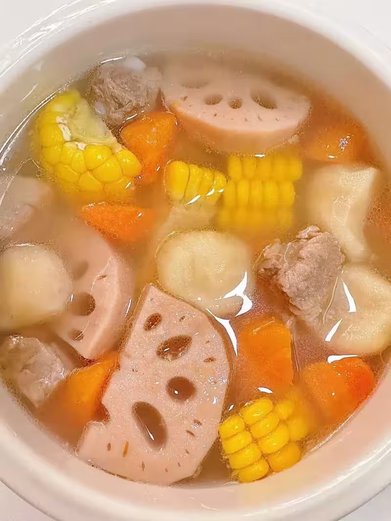 蓮藕富含膳食纖維,能推動腸道蠕動,馬蹄水分足還清甜,可補水潤燥、助力腸道通暢。搭配香甜的玉米、脆嫩的胡蘿蔔和軟爛的排骨,湯汁鮮美,孩子愛喝,喝完腸胃舒服,排便也更輕鬆。