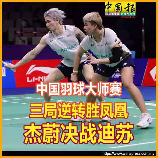 (中國.深圳20日綜合電)以2比1逆轉反勝中國次號種子兼衛冕冠軍馮彥哲與黃東萍,馬來西亞世界冠軍陳堂傑與杜依蔚延續強勢表現,殺進中國羽球大師賽混雙決賽,將和泰國的迪查波與蘇皮莎拉爭奪冠軍。